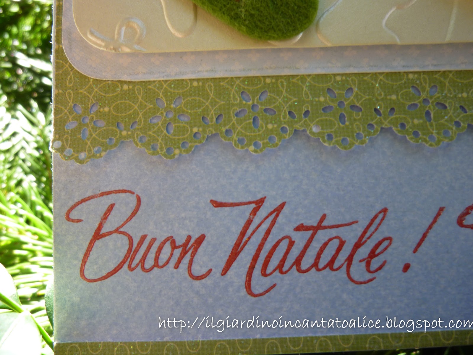 -Su un biglietto azzurro (perchè siamo gli Azzurri!!) 16x16 ho timbrato in basso la scritta Buon Natale (Timbro Impronte d'autore 522-0) e l'ho embossata con la polvere da rilievo Clear per ottenere l'effetto rilievo e lucido della scritta